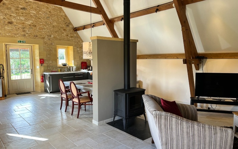 A vast 68 m² living room, dining room, equipped kitchen with wood stove, staircase for access to a terrace, 2 beautiful double bedrooms.
