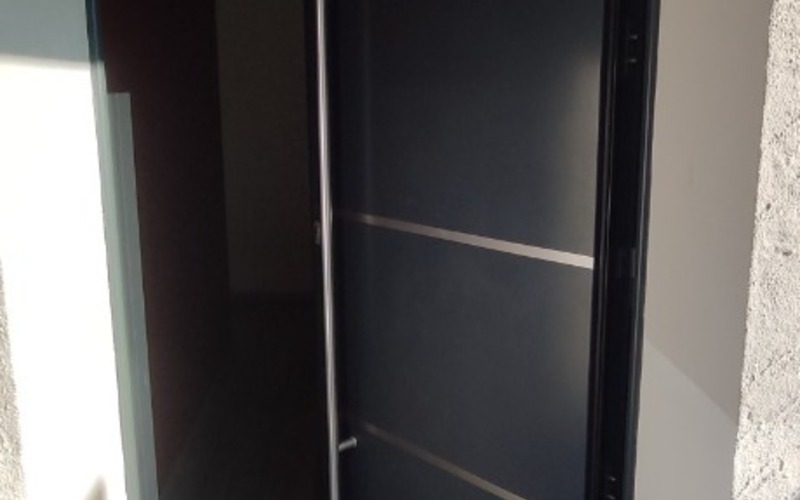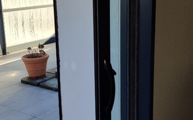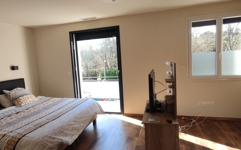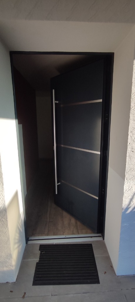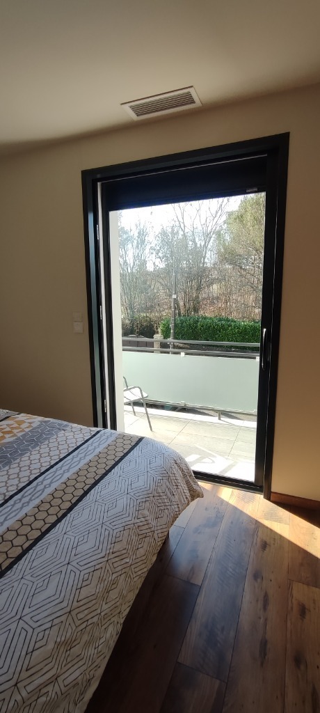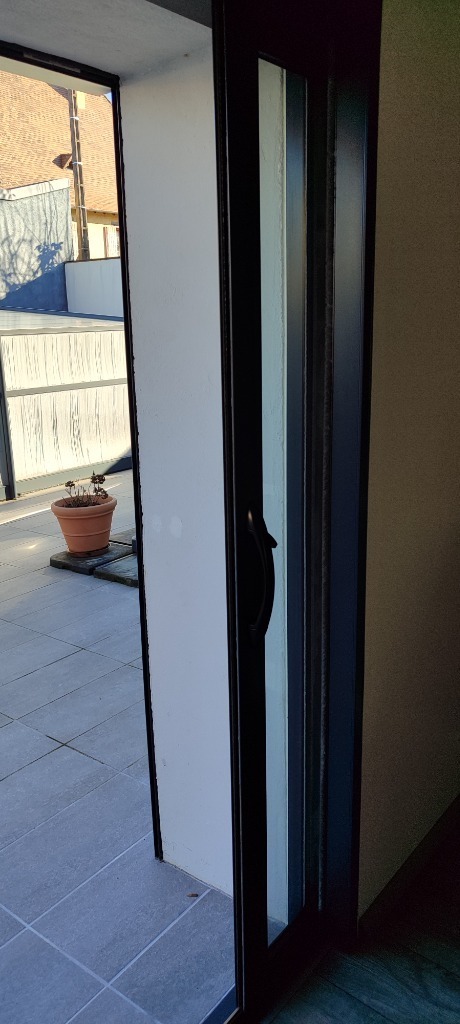 Menuiserie haut de gamme avec 2 couleurs (Blanc intérieur et Anthracite à l'extérieur) oscillo-battant, à galandage pour toutes les baies aluminium, volets roulants aluminium éclectique, pompe à chaleur réversible en gainable, etc.....
