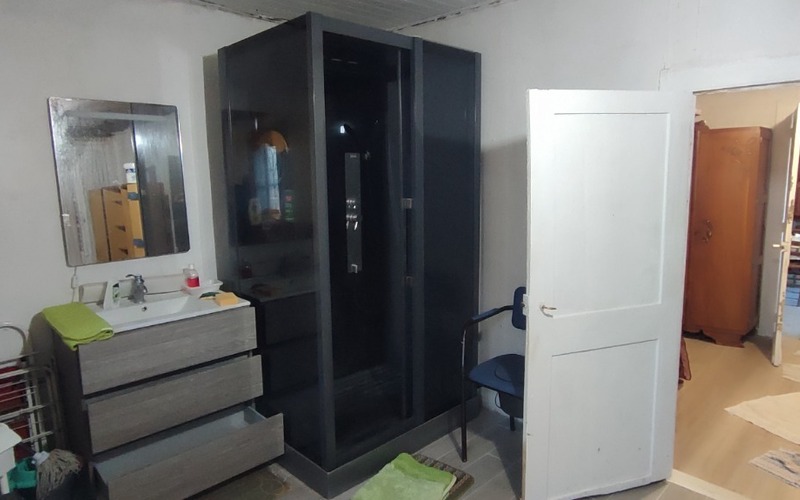 Une cuisine de 20 m² avec cheminée et poêle à bois, un salon de 15 m², une chambre de 15 m² avec une salle d'eau et wc sanibroyeur.