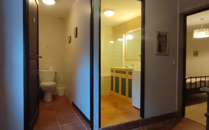 RDC: Entrée dans une pièce de vie comprenant un séjour salon avec une (cheminée condamnée actuellement) une cuisine équipée, un dégagement une chambre, une salle de bains et un wc.