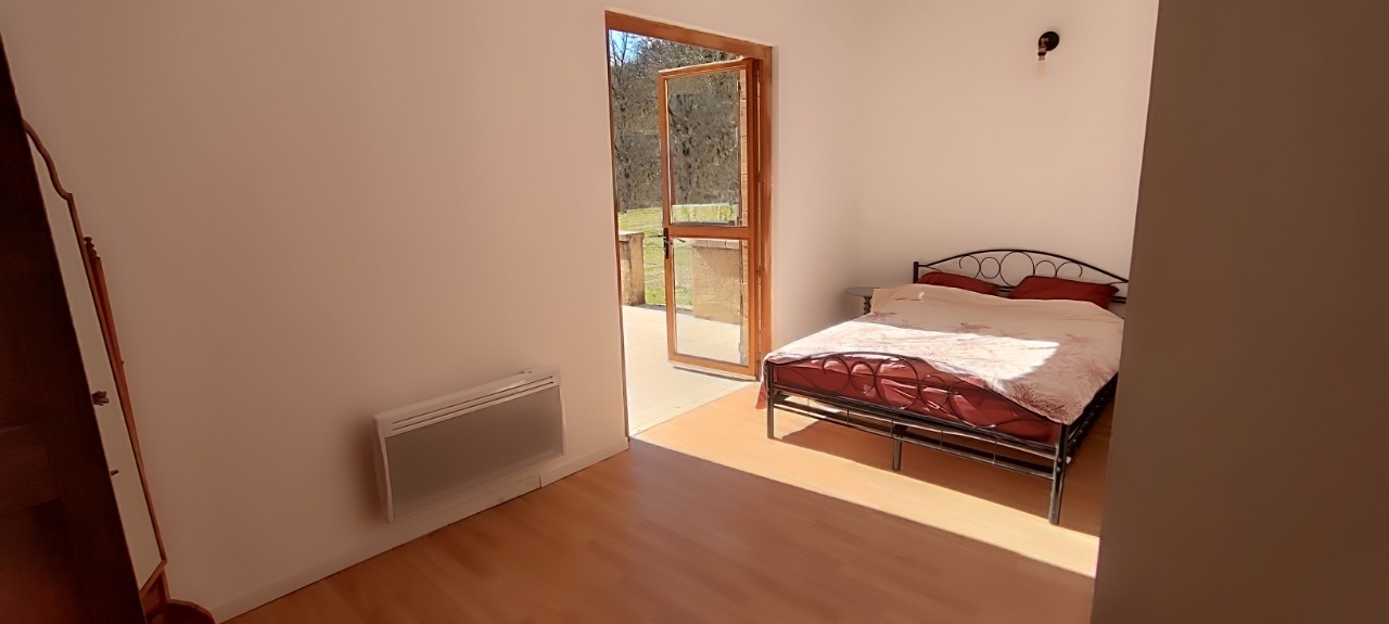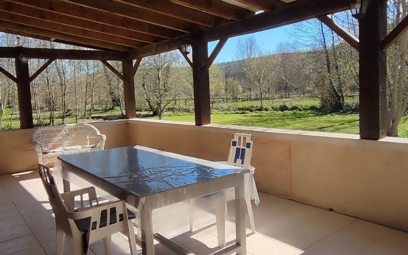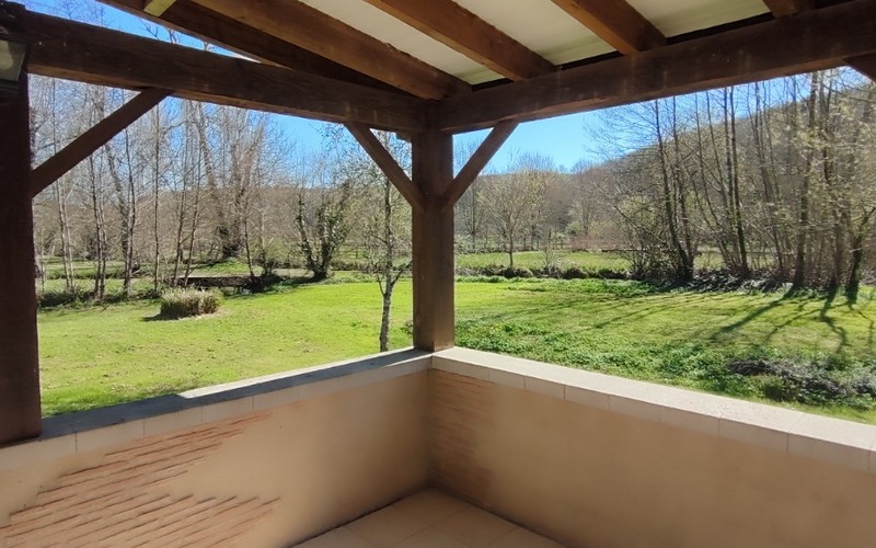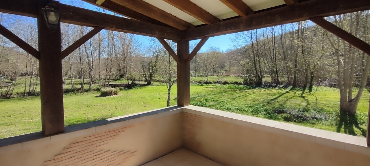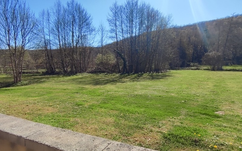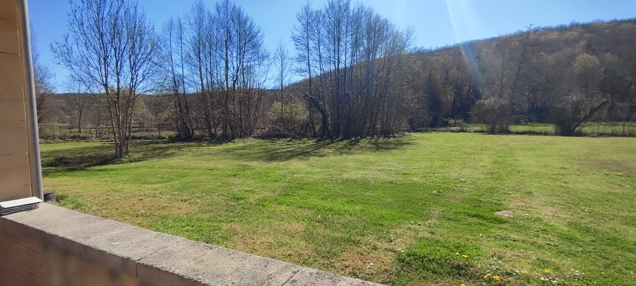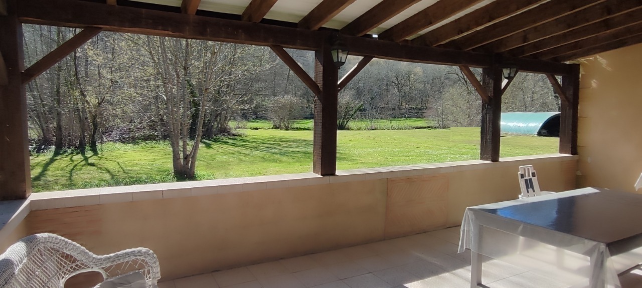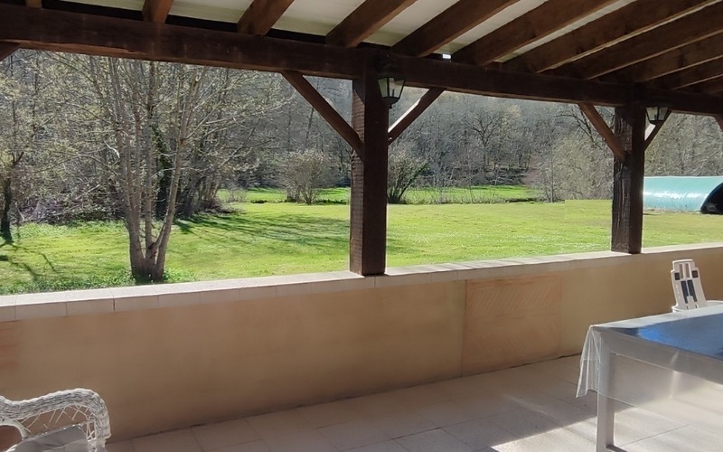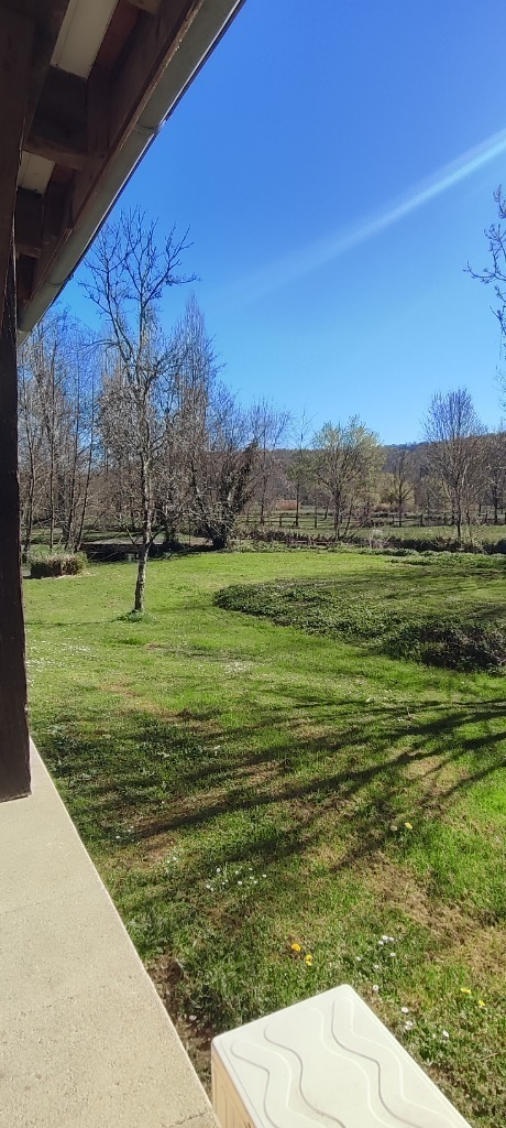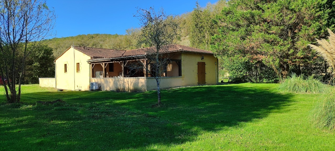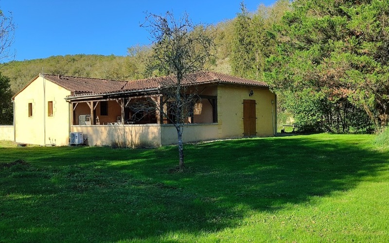 Entre Lalinde et Beaumont du Périgord, Jolie maison de plain-pied, bonne construction de l'année 2000 de 170 m² habitables en béton cellulaire de 25cm d'épaisseur, composée d'une grande pièce de vie de 70 m² environ, une belle et agréable terrasse couverte, une cuisine, 3 chambres entre 12 et 20 m² dont une avec terrasse, une salle d'eau avec douche, wc séparé. Très belle et grande terrasse couverte vue côté jardin, le tout sur un agréable terrain de 5 000 m² non clos avec un petit cour d'eau en limite de propriété "La Couze".