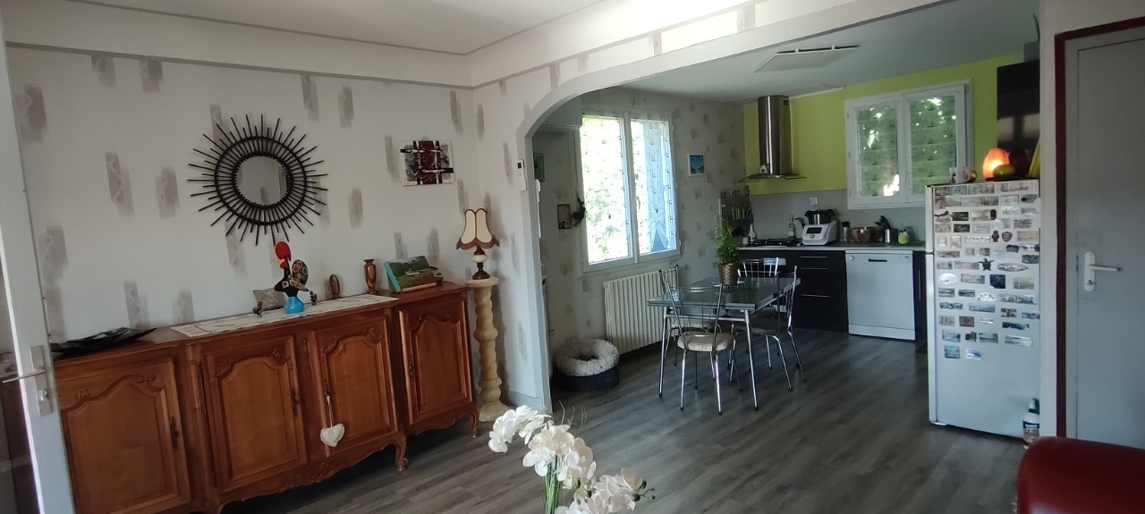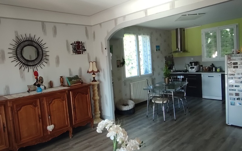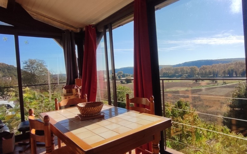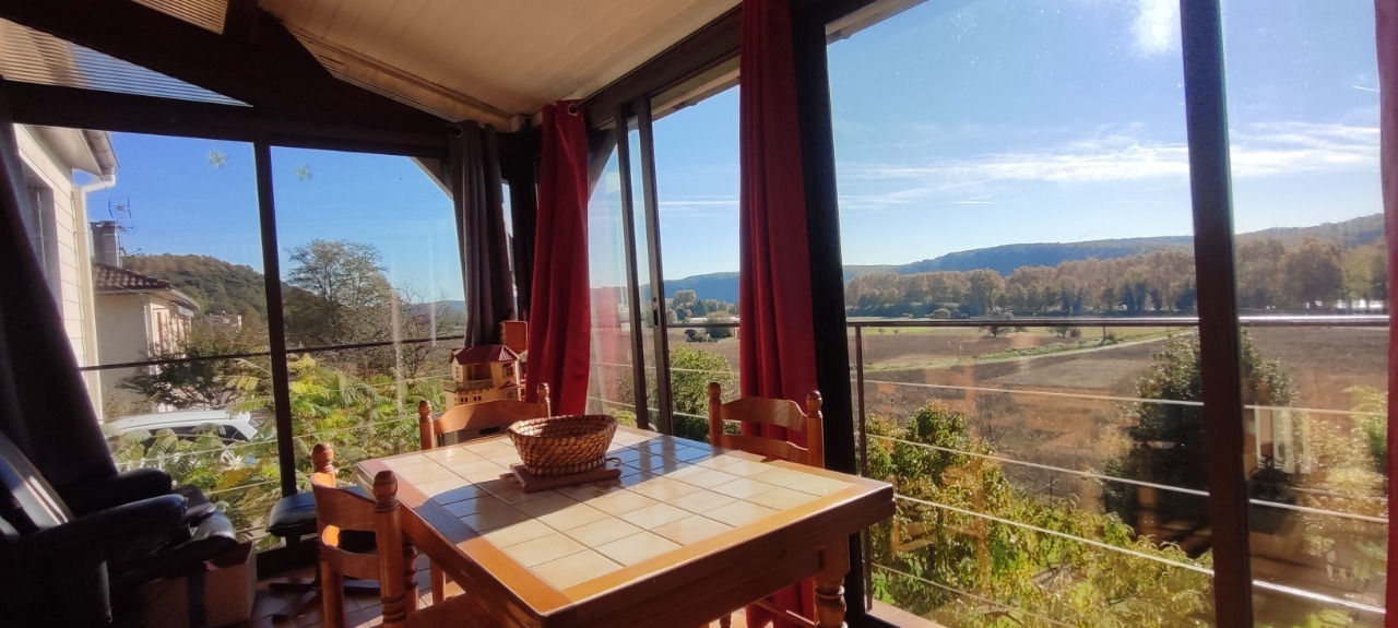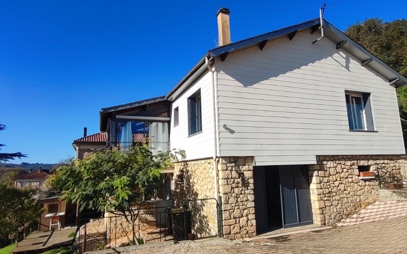 Tout proche du centre ville de Lalinde, jolie maison rénovée de 73 m² habitables TBE avec vue dégagée composée, d'une pièce de vie avec coin cuisine équipée, une véranda chauffée avec vue dégagée, 2 chambres, salle d'eau, rdc un bureau, un garage, une buanderie avec cuisine d'été, une véranda, chauf pompe à chaleur, isolation par l'extérieur, terrain de 888 m² mi-clos plus partie stationnement.